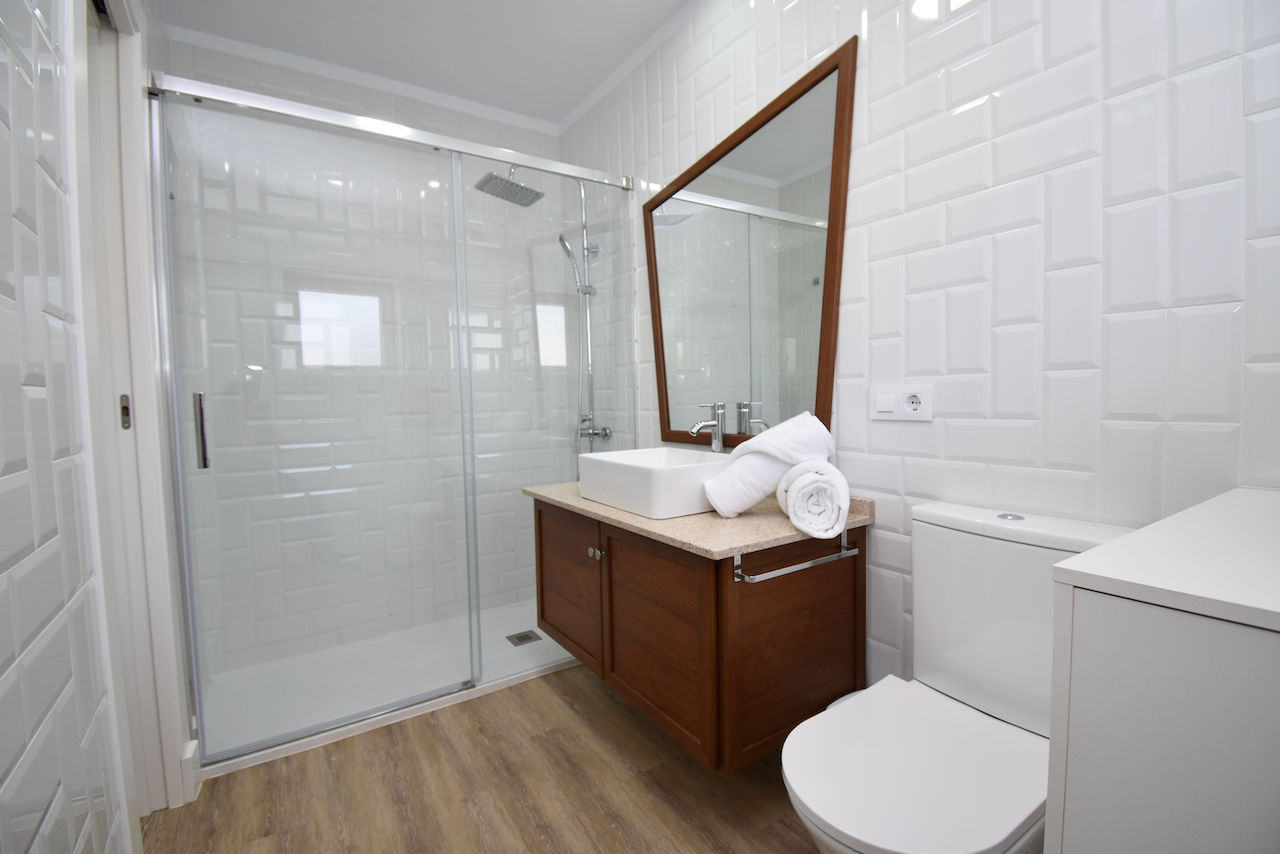 • Badezimmer mit Einzelwaschbecken, Dusche und Toilette