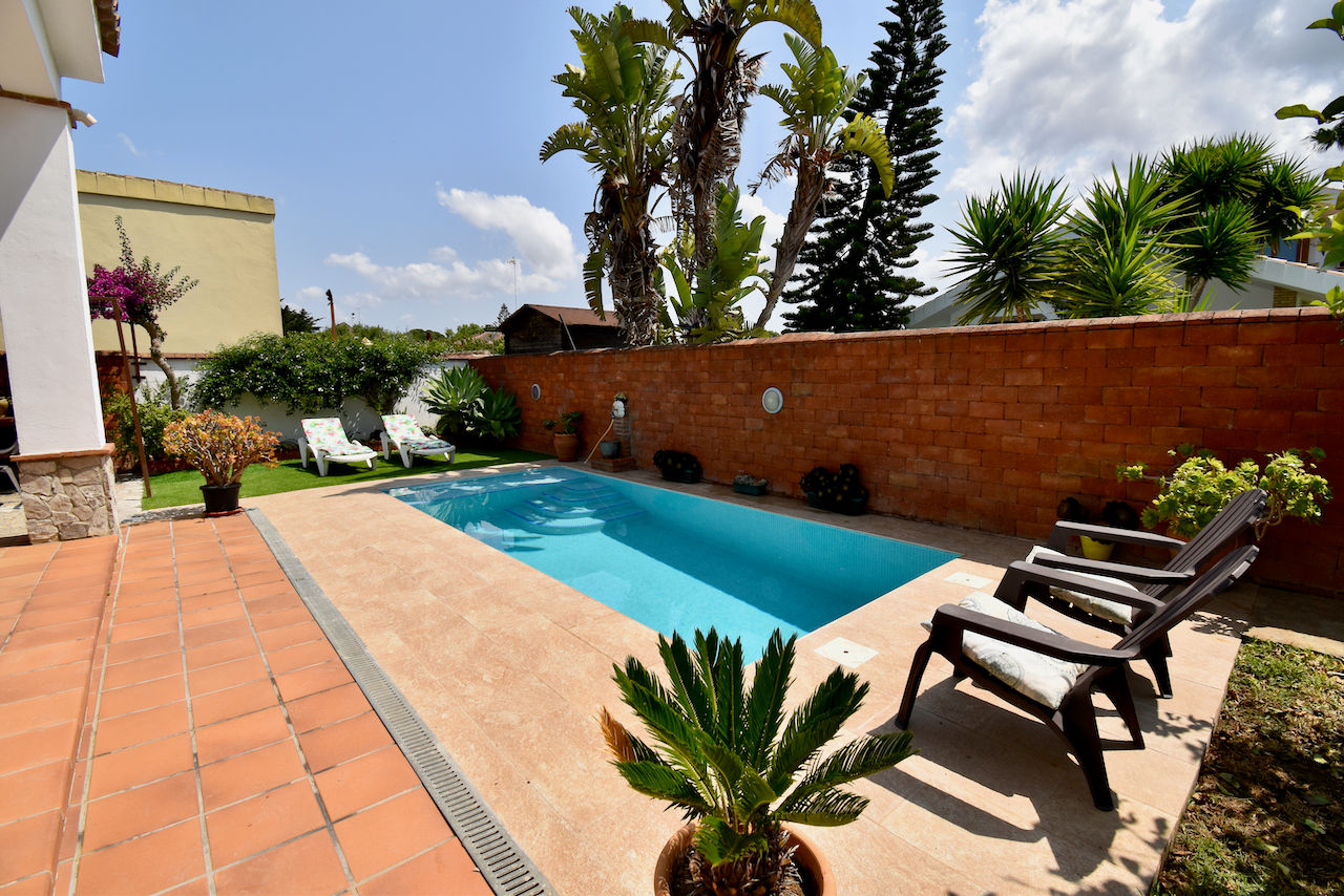 Liebliche und komfortable Villa mit privatem Pool in Chiclana de la Frontera, Costa de la Luz, Spanien für 8 Personen. Das Haus befindet sich in einer städtischen Küsten-Umgebung und in der Nähe von Restaurants und Bars und Supermärkten.