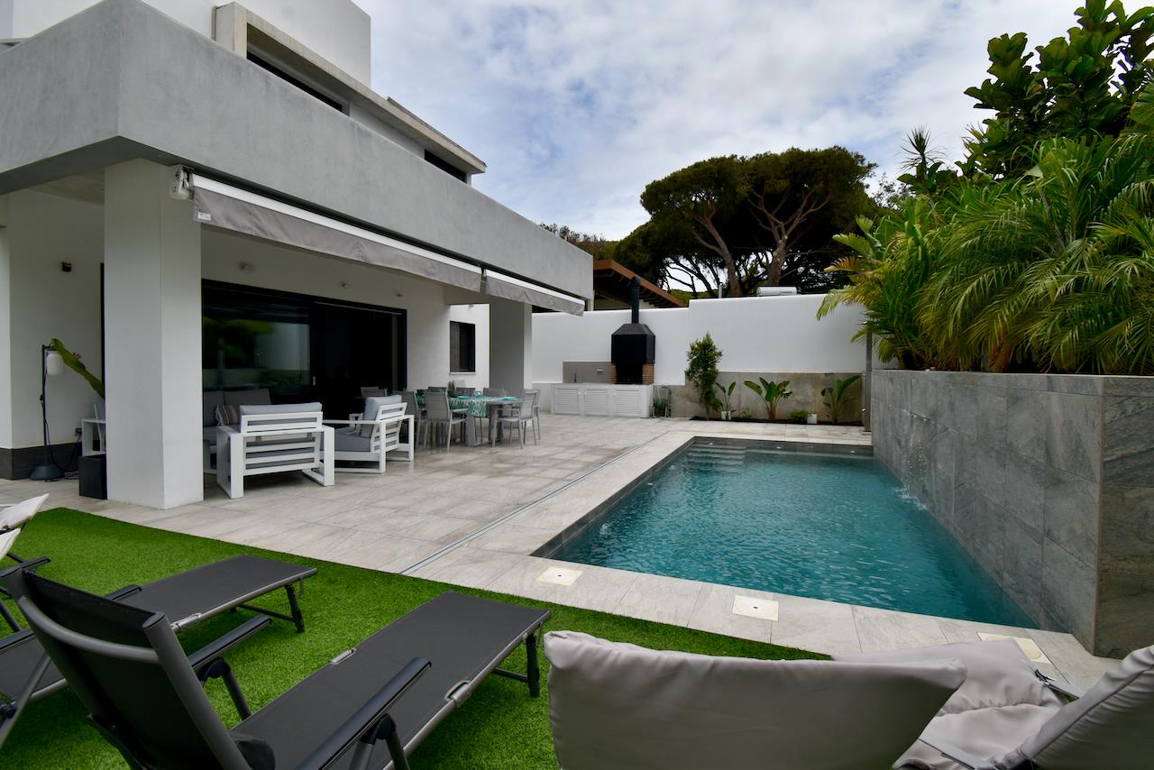 Villa in Chiclana de la Frontera, Costa de la Luz, Spanien mit privatem Pool für 12 Personen. Das Haus befindet sich in einem Wohngebiet nahe dem Strand, in der Nähe von Restaurants und Bars, Geschäften, Supermärkten und einem Tennisplatz, nur 350 m vom Strand La Barrosa entfernt.