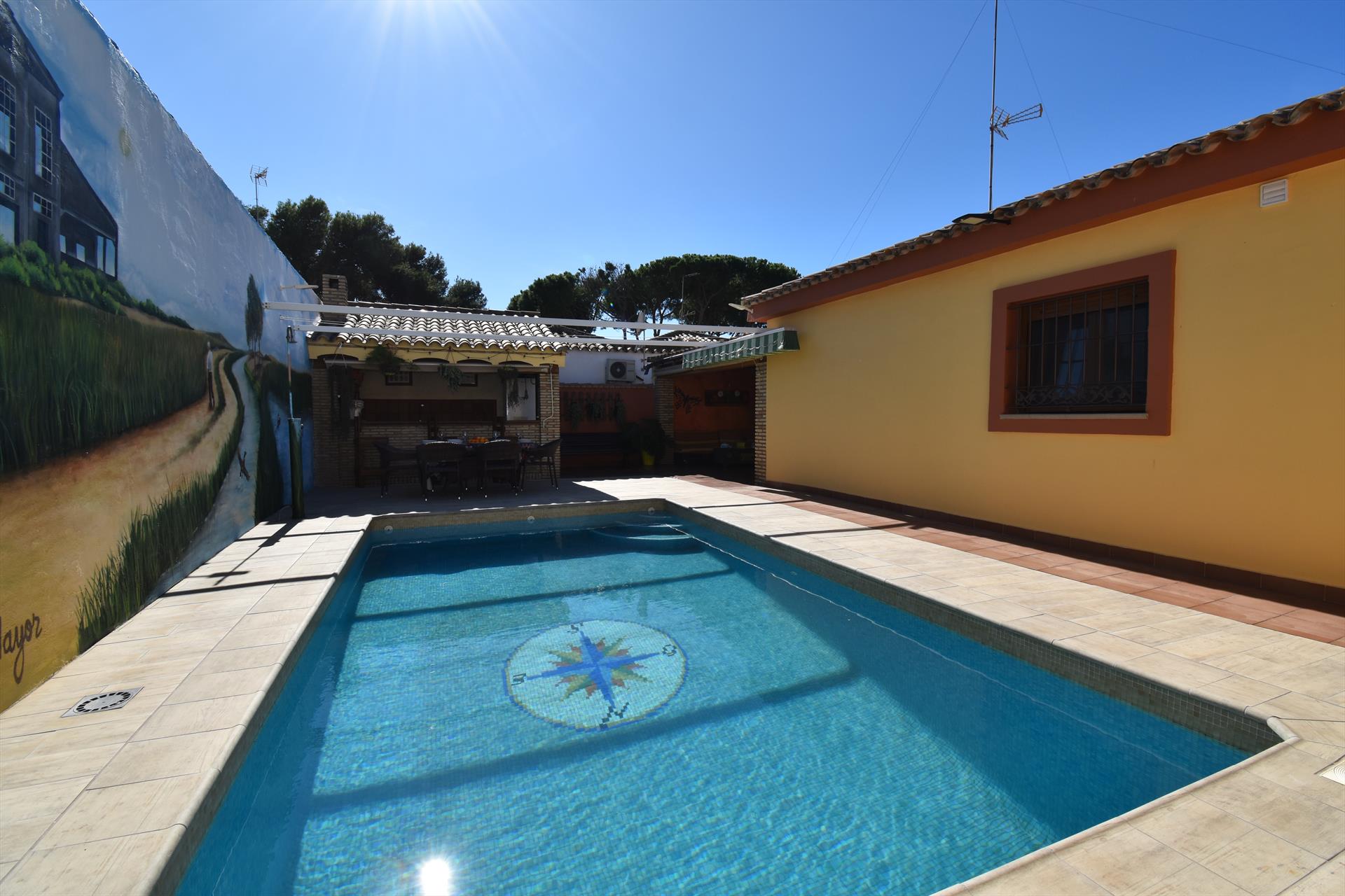 Komfortable Villa in Chiclana de la Frontera, Costa de la Luz, Spanien mit privatem Pool für 6 Personen. Das Haus befindet sich in einer städtischen Umgebung, in der Nähe von Restaurants und Bars und Supermärkten und etwa 2 Km entfernt vom Strand von La Barrosa.