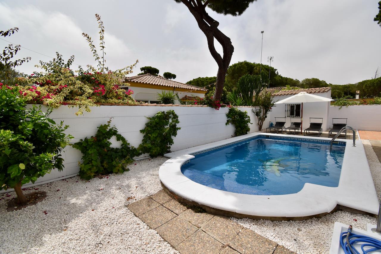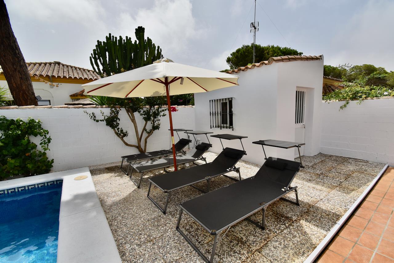 Schöne und komfortable Villa mit Privatpool in Chiclana de la Frontera, Costa de la Luz, Spanien für 6 Personen. Das Haus befindet sich in einem bewaldeten und ruhigen Wohngebiet in Strandnähe und ist 5 km von Chiclana oder La Barrosa entfernt.