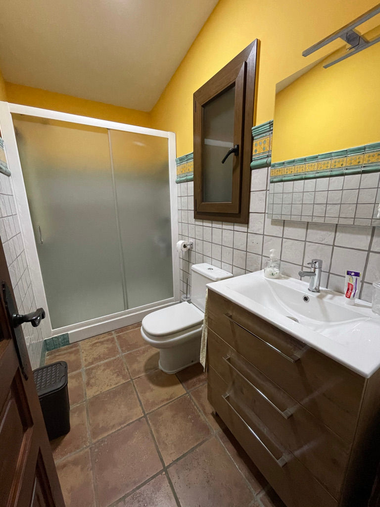 • Badezimmer mit Einzelwaschbecken, Dusche und Toilette