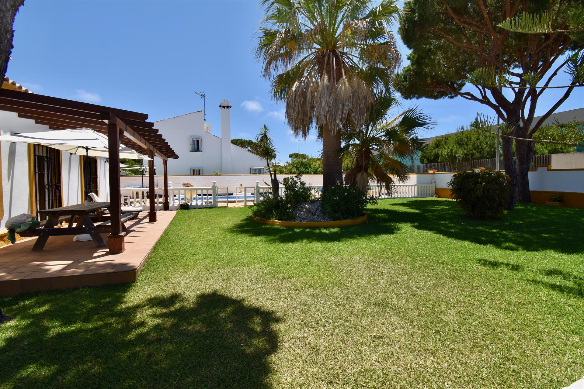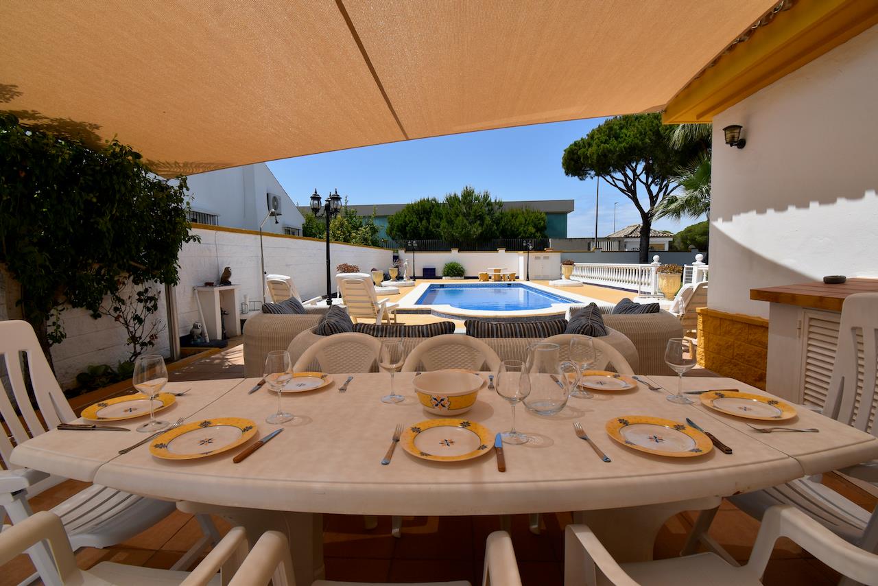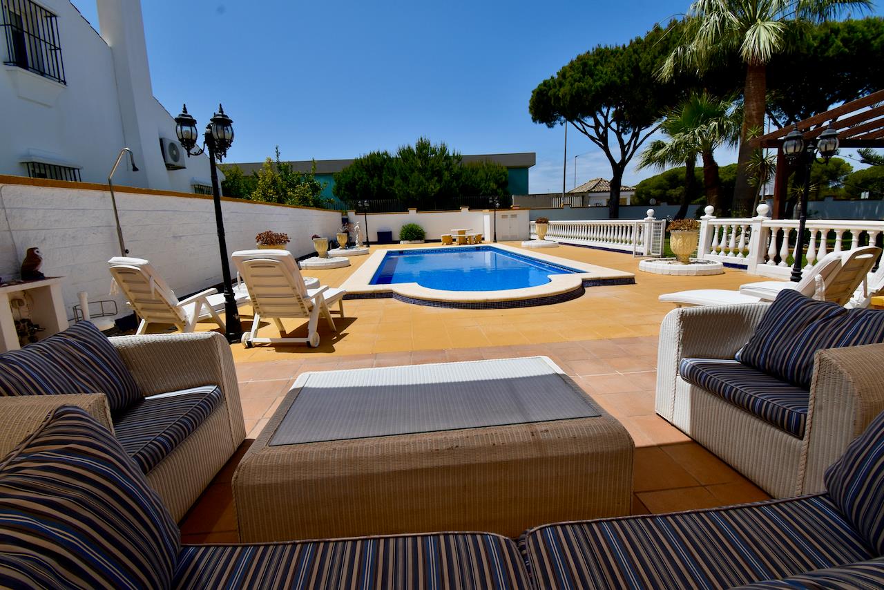 Grosse und klassische Villa mit privatem Pool in Chiclana de la Frontera, Costa de la Luz, Spanien für 8 Personen. Das Haus befindet sich in einer städtischen Umgebung, in der Nähe von Restaurants und Bars und Supermärkten und etwa 500 M entfernt vom Strand von La Barrosa.
